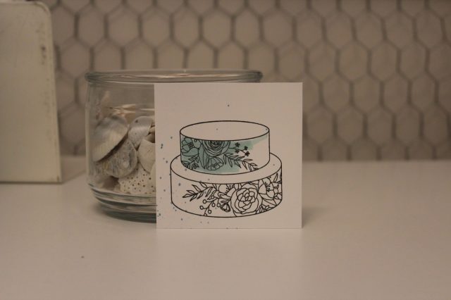 Here is the stamped image that I spritzed. This wasn’t my favorite. I think if I had chosen a different stamped image I would have liked it better. I felt the cake image wasn’t the right theme to spritz. I like the idea of it just not the final result.