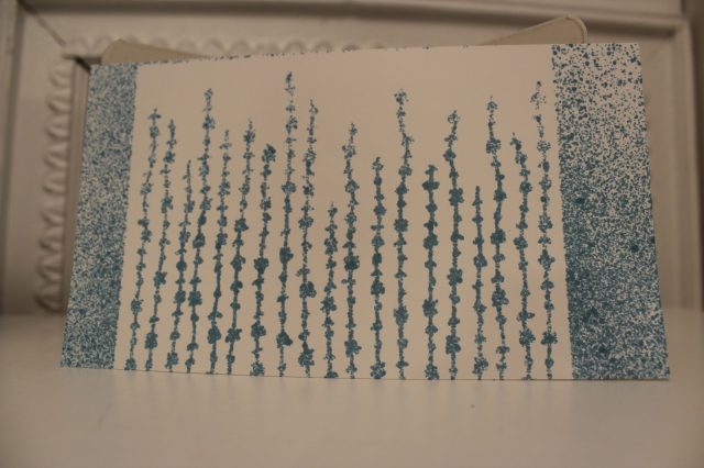 Unfortunately the image here doesn’t show the true detail of this spritzing. You can tell from my hand holding this piece that it is actually vellum (cardstock). I then put embossing powder and heat embossed it. It became the background of the following card: