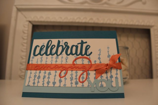 This uses Celebrate You Thinlits Dies (FREE in the Sale-A-Bration 2018 catalog). The card uses an Island Indigo cardstock for card base and the “celebrate “die, Soft Sky cardstock as an accent and for the “you” die, and Calypso Coral for the “amazing” die and Shimmer Ribbon (Free from Sale-A-Bration 2018 catalog).