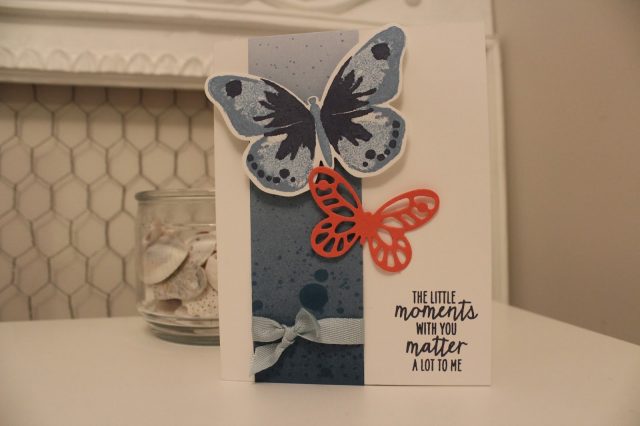 This card used the Dapper Denim DSP as a background layer. I think I will replicate this card but spritz it once the DSP piece is adhered to the white card base. I can’t decide if this “little moments” card is my favorite or if the “celebrate” card is? Which is your favorite card using the spritzing technique?