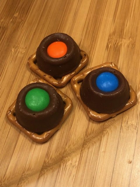 Ingredients: Butter Snap square pretzels, bag of Rolos, and a bag of M&Ms. When I make these I typically get the large bag of Rolos because there have been known to be some Rolo thieves in my family! I usually have some of each item left over!