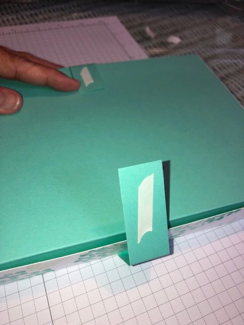 - Cut the Whisper White piece so that it goes from one side of the box to the other and use it to join the Coastal Cabana piece. Place a piece of Tear & Tape on each end of the Coastal Cabana and adhere the stamped Whisper White to it.