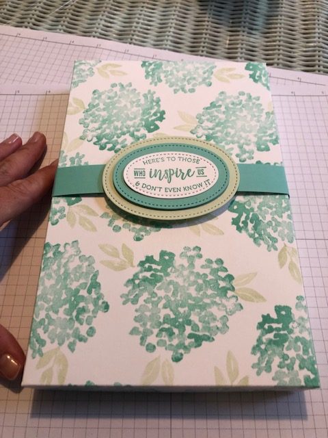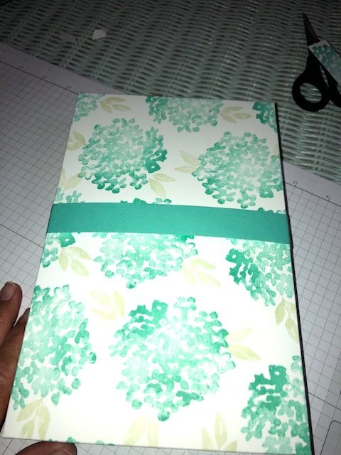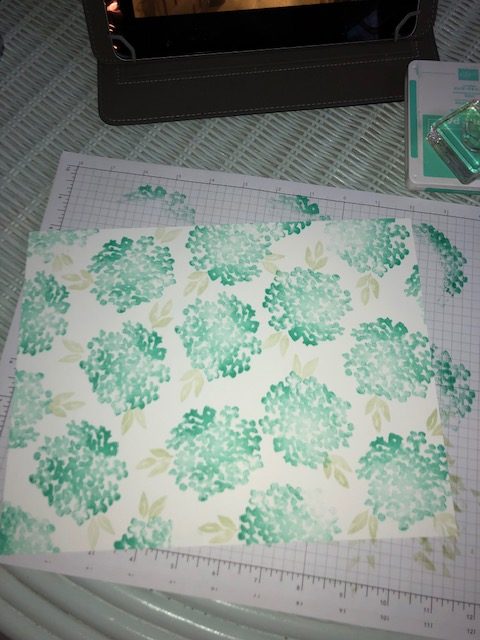 Stamp the same image you used on your note paper or a coordinating image on a piece of 8 1/2 x 11 inch Whisper White cardstock. For this project I use the hydrangea image from the Beautiful Friendship stamp set. This image is inked in Coastal Cabana. The leaf image was inked in Soft Sea Foam. Repeatedly randomly stamp the hydrangea in groups of three spaced slightly apart. Add in the Soft Sea Foam leaf image.
