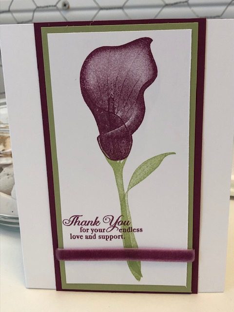 While the frogs are so much fun, I think if I had to choose my very favorite Sale-A-Bration stamp set I would have to say it is this set: Lasting Lily – it is also one in the Distinktive line of stamps that Stampin’ Up! has come out with. The shading and detail that this type of stamp produces is hard to really appreciate from a picture. This is a very versatile stamp set; it can be used to make any type of card from sympathy to birthday.
