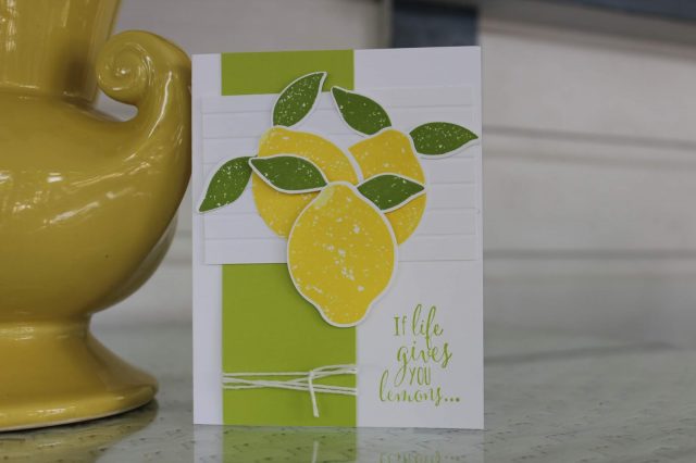 This card was made using a card base of Whisper White. Lemon Lime Twist cardstock was used as an accent. An additional Whisper White accent piece was run through the Big Shot using the Simple Stripes embossing folder. The lemons were stamped using Pineapple Punch on Whisper White and punched out using the Lemon Builder. The leaves were stamped on Whisper White using Granny Apple Green and punched out also using the Lemon Builder punch. the lemons were placed on the card using Stampin’ Dimensionals. The finishing touch on the card was the Whisper White baker’s twine tied in a knot.