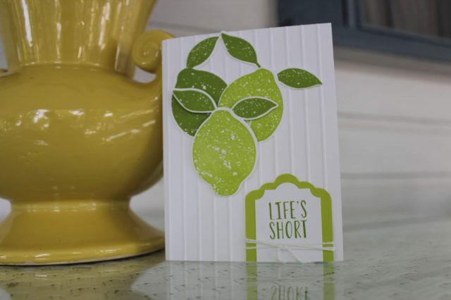 For this card I switched it up a bit and stamped the “lemon” image in green to create limes. I used two shades of green to stamp the limes: Granny Apple Green and Lemon Lime Twist. The leaves and limes were both stamped on Whisper White cardstock. The card base was created using Whisper White cardstock and run through the Big Shot using the Simple Stripes embossing folder. Life’s Short was stamped using Lemon Lime Twist on Whisper White cardstock and punched out using the Everyday Label and layered on top of Lemon Lime Twist punched out using the Scalloped Tag Topper punch. This piece was wrapped with Whisper White baker’s twine.