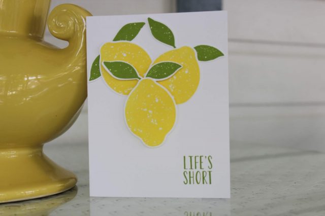 This very simple card was created using a simple Whisper White card base, and lemon image stamped on Whisper White cardstock using Pineapple Punch and punched out using the Lemon Builder punch. The leaves were stamped in Granny Apple Green and also punched out using the Lemon Builder punch. Life’s short was stamped directly onto the card based in Lemon Lime Twist. The two background lemons were adhered to the card with Snail and the foreground lemon was adhered using Stampin’ Dimensionals.