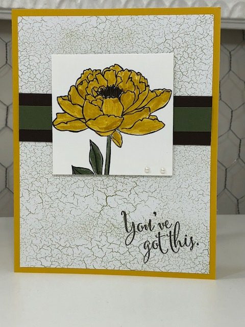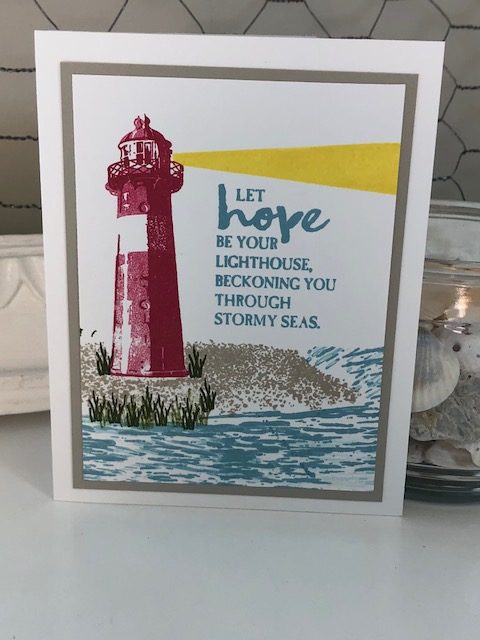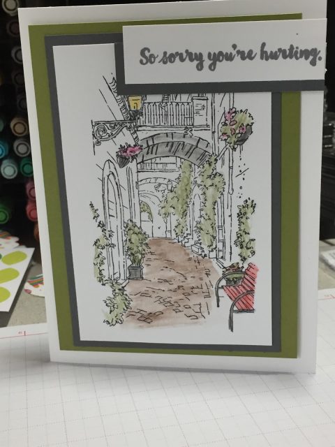 This one is going to a friend that I just found out is facing some really hard times and doesn’t see a silver lining in sight! I stamped the image from Mediterranean Moments stamp set (Wood-mount 143188 $28.00, clear-mount 143191 $20.00). I colored in the images using the Stampin’ Blends premier alcohol markers (p. 31 or the Occasions Catalog $4.50 per marker or $9.00 per Combo Pack. The sentiment was from Here for You (wood-mount 141541 $25.00, clear-mount 142164 $18.00) This set is also available in French.