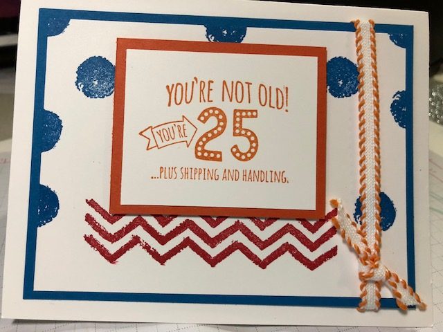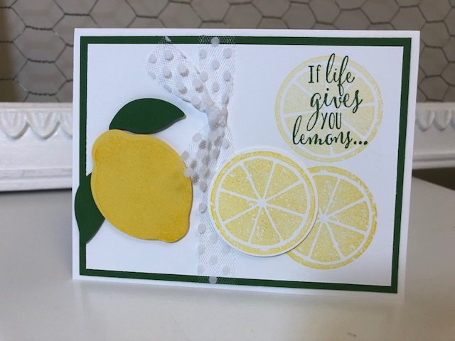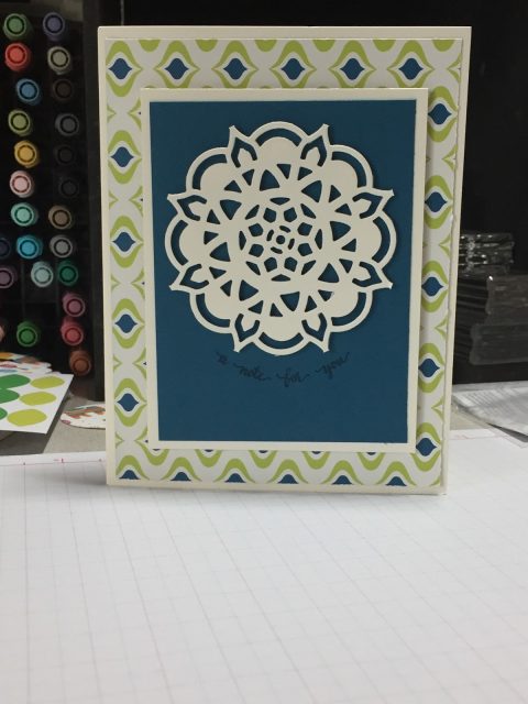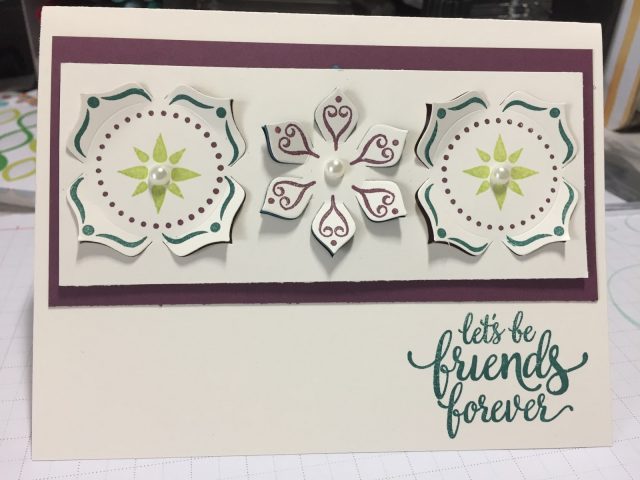 I love the way the images pop up off the card because of the dies used on the layer. This card was made with the Eastern Medallions Thinlits (143725 $33.00 usd) and the Eastern Beauty Stamp set (143657 $21.00 usd). I used Very Vanilla for the card base and Fresh Fig as the layer. The images were stamped with Tranquil Tide (144085 $6.50), Lemon Lime Twist (144086 $6.50), and Fresh Fig (144082 $6.50) (These are part of the 2017-19 In Color collection). The images were finished off with the Pearl Basic Jewels ( 144219 $5.00). This card is going to go to one of my friends from Texas that I haven’t talked to in a while. She is a stamper and I know she’ll appreciate the card but even more the sentiment!