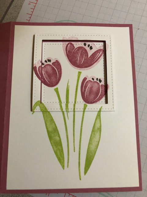 Tranquil Tulips is one of my new favorite stamp sets! This set is only available to those who host a gathering. (143757 $10 worth of hostess rewards). I used the eclipse technique to create the frame. Lemon Lime Twist (144086 $6.50) ink was used to create the stems of the tulips. The background of the tulips was stamped in Pink Pirouette (126956 $6.50) while the foreground is stamped in Sweet Sugarplum (141395 $6.50). The inside of the tulips is stamped in Early Espresso (126974 $6.50). This card is going to mailed to a friend of mine from Michigan that lost her mother recently. If you love Sweet Sugarplum like I do, don’t wait to purchase it. It will no longer be available after May.