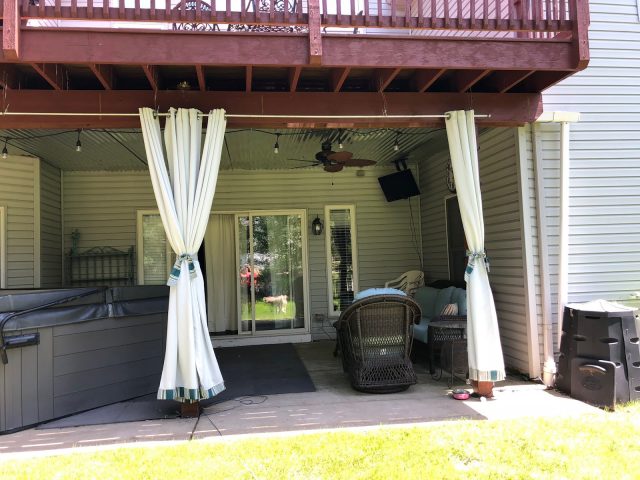 Over the last two weeks I’ve had the “opportunity” to exercise my creative juices in non-card making ways! We have a very nice outdoor area off of the lower level of our home. There is a seating area and a hot tub. Last year we put up curtains to give us a little protection from the wind in the winter and provide a bit of privacy. Often times the wind will blow the curtains around and in a strong wind they end up twisting and turning. We wanted a way to add weight to the curtains so a couple months ago , my husband, Matt, went shopping for outdoor material to add a bottom edge pocket.